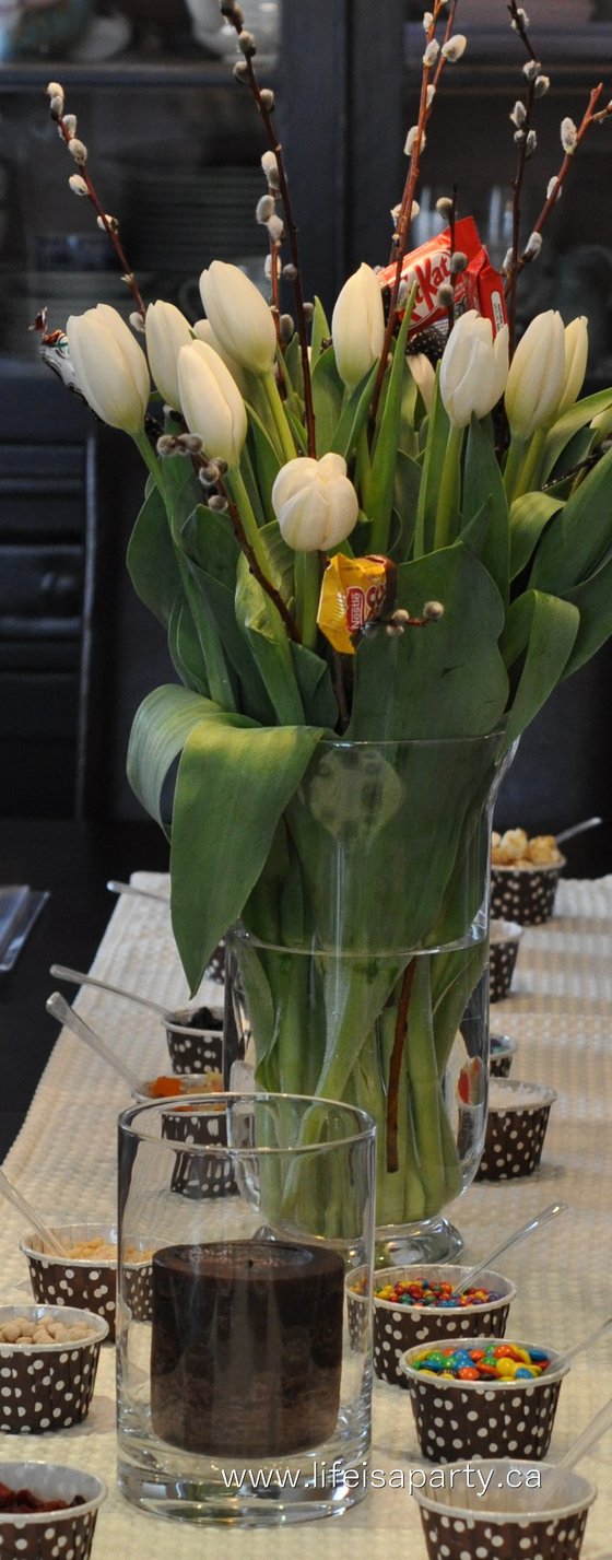 I filled another vase with just pussy willows and chocolate flowers, and used them as part of the centerpiece on the dessert table.