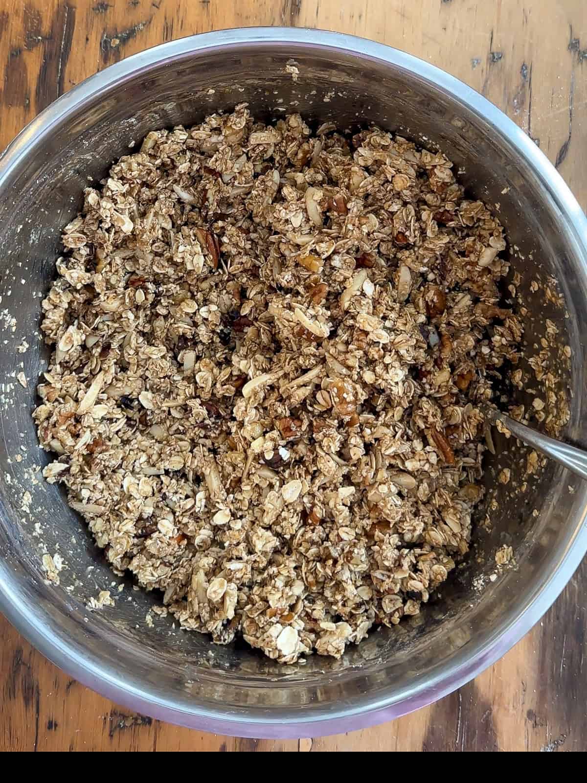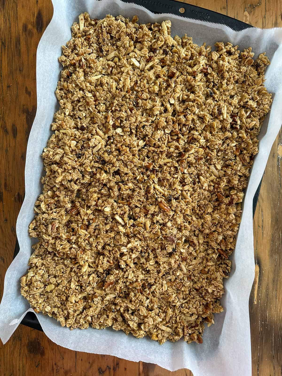 The key to great chunky granola with clusters is to not over-stir during baking. After the first 30 minutes, stir the granola so the top and edges don't burn.