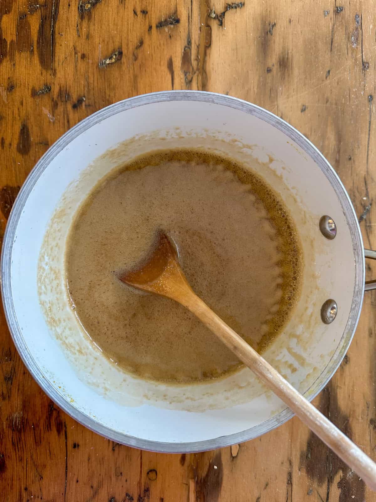 - In a small pan combine sugar, butter, salt, and water and heat over a medium heat until it boils, stirring occasionally. Remove from the heat and stir in the vanilla.1 cup brown sugar, ½ cup butter, ⅓ cup water, ½ teaspoon salt, 2 teaspoon vanilla extract