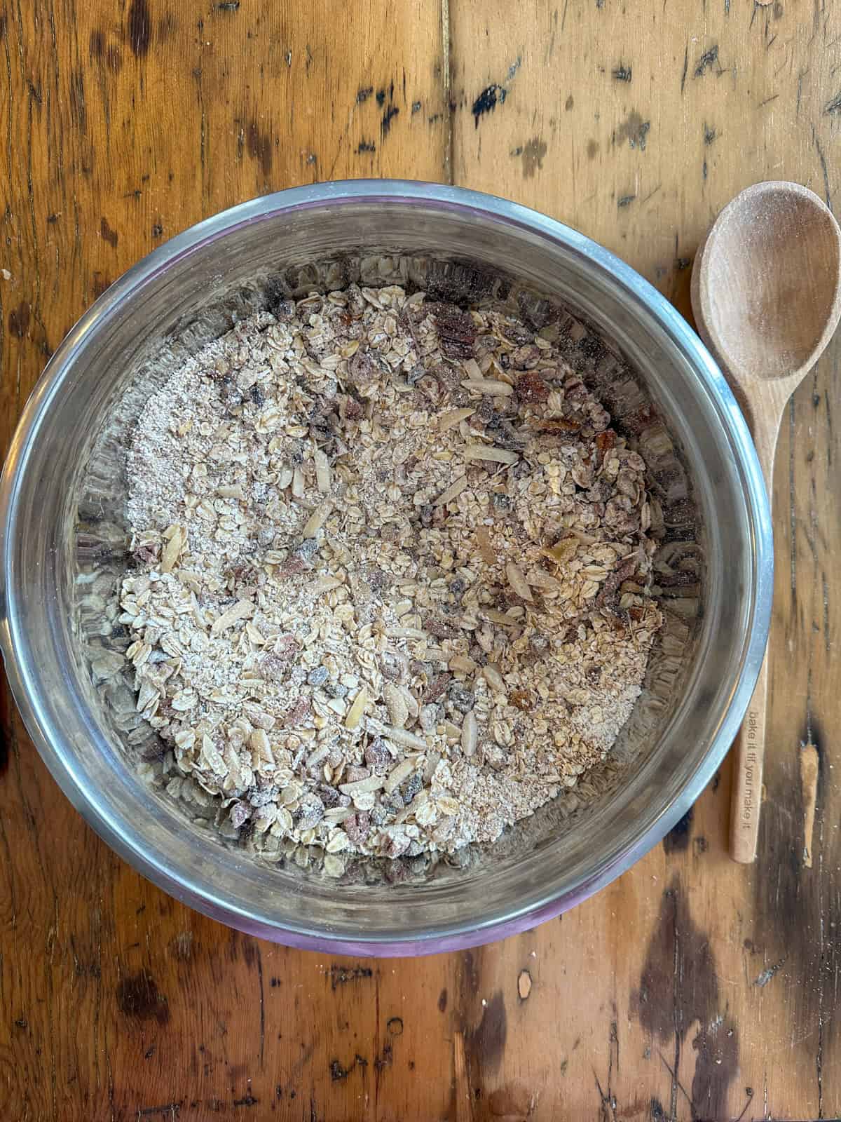 - Step 2: Combine in a large bowl the oat flour, quick oats, nuts, cinnamon, and nutmeg and stir.