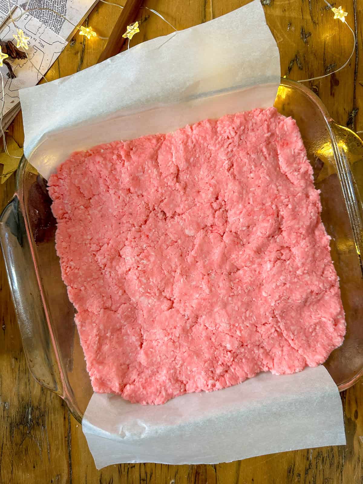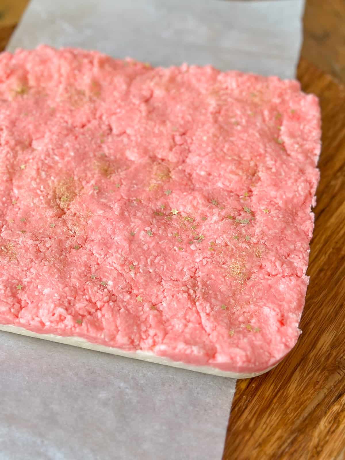 - Step 5: Add The Pink Layer Press the pink mixture evenly over the white layer in the baking dish. Again, press firmly and make sure the layer is even across the entire surface. If you're adding star sprinkles or edible glitter, gently press them into the top now while the surface is still slightly sticky.