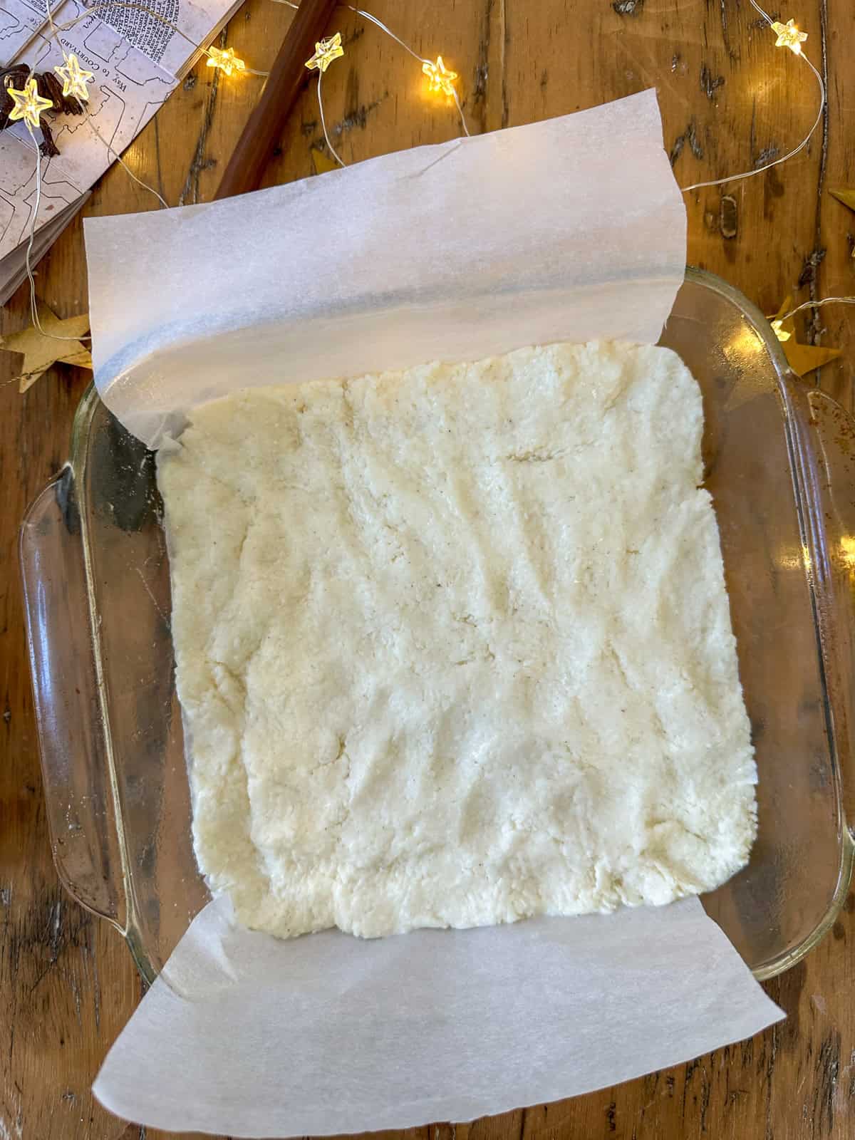 - Step 3: Press The White Layer Transfer half of the mixture to your prepared baking dish. Using clean hands or the back of a spoon, press it firmly into an even layer across the bottom of the pan. Make sure it's packed down well and reaches all the corners. The more evenly you press this layer, the better your final result will be.