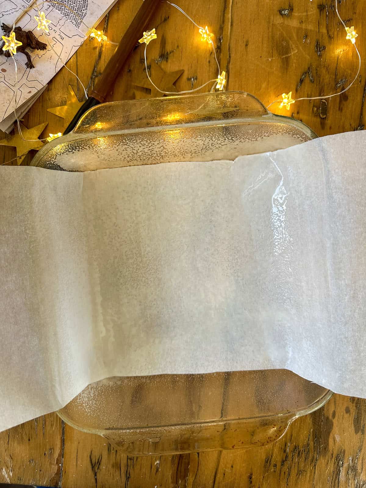 - Line an 8x8 inch baking dish with parchment paper and spray with cooking spray.