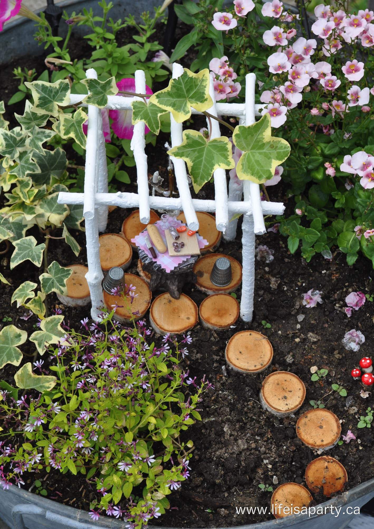 Since I've made many fairy gardens over the years, I know that the tiny little cute pieces can get blown around and lost, so this time I glued things together before I put them in the garden and it's worked great.