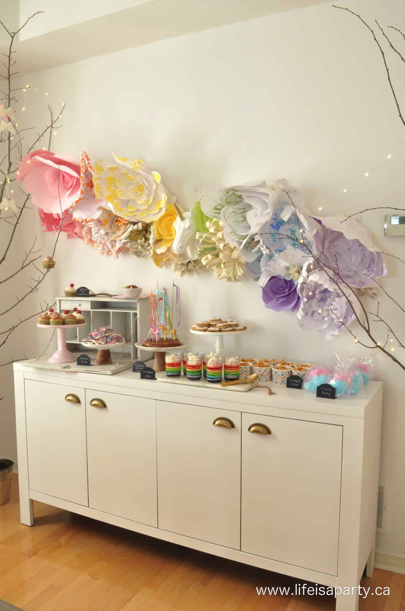 We've made paper flowers a few times, you can see exactly how to make them here at our Paper Flower Making Video. For this party we wanted a rainbow theme, so we made our flowers in a pastel rainbow colours. A lot of the flowers we already had from other parties, and to make them fit this theme we added colour with paint.