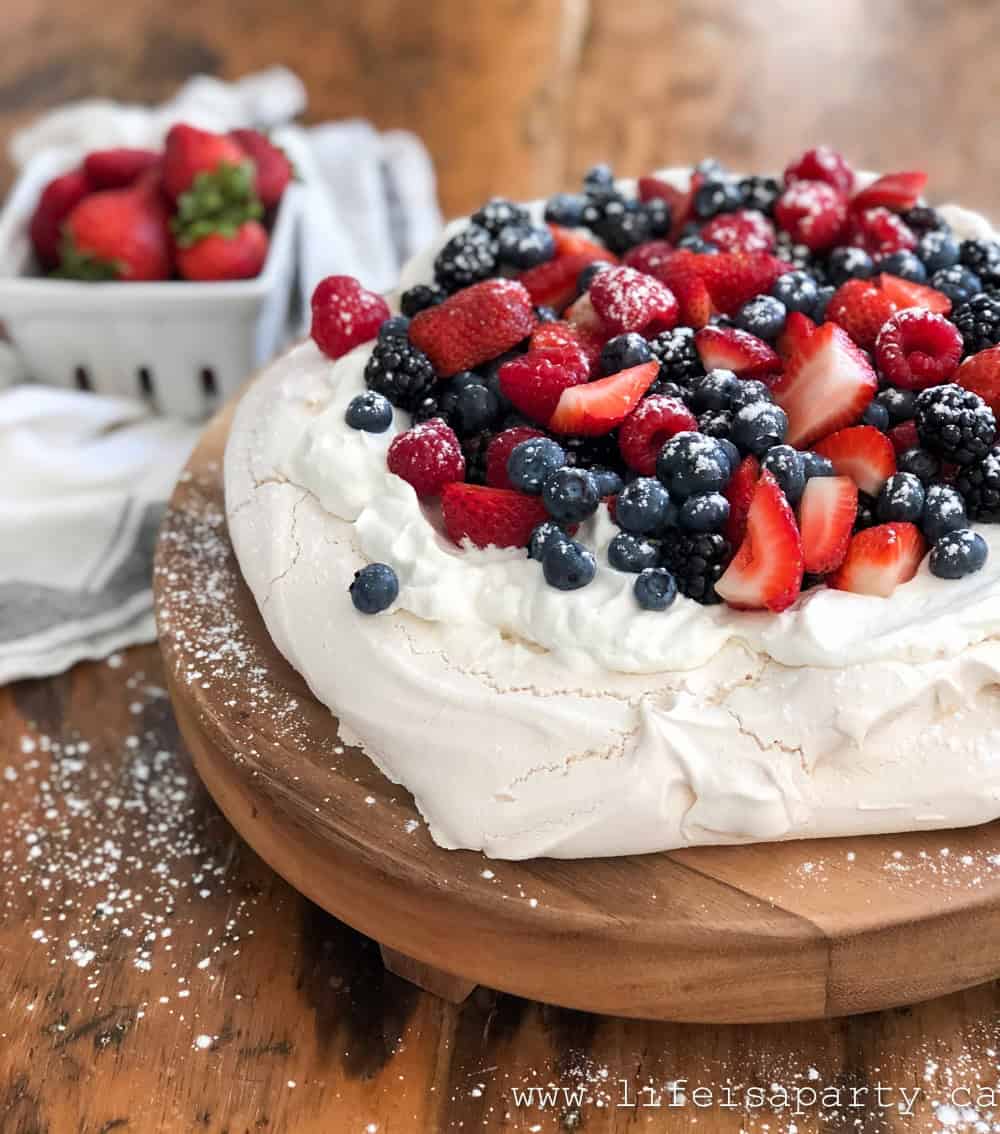 This summer berry pavlova dessert is always very well received. It always looks like a real show stopper on your dinner table. That combination of fresh summer berries, meringue base with it's marshmallow center, and fresh whipped cream is everyone's favorite special occasion dessert. It's the perfect light ending to a big meal on a summer evening.