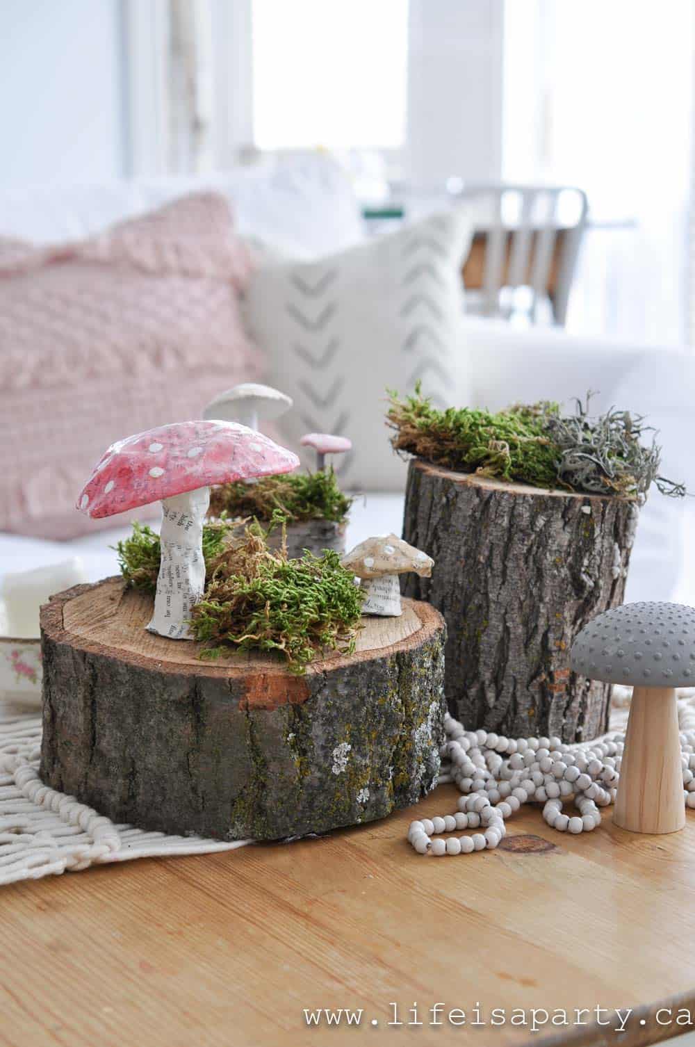 On the coffee table I used more mushrooms, including some that are made of paper mache. I created the base from tinfoil, did the paper mache with old book pages. They look really cute for spring on some log pieces and with some moss.